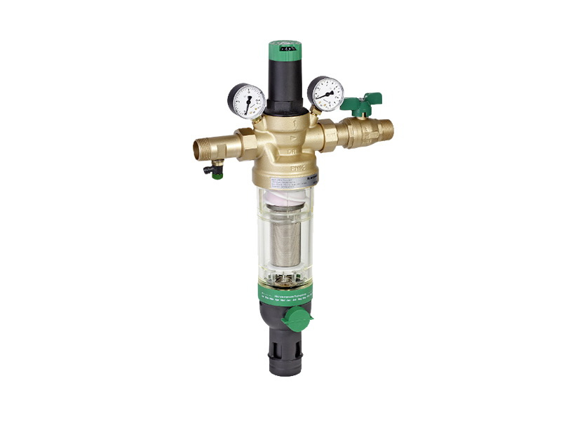 Фильтр серии HS 10S представляет собой комбинированный водоразборный узел и объединяет в себе корпус, чашу фильтра, манометры (впускной и выпускной), пружинный стакан, сетчатый фильтрующий элемент, впускной обратный клапан, вкладыш клапана, запорный шаровой клапан и шаровой клапан с дренажным штуцером, а также накидной ключ (для клапана и чаши).