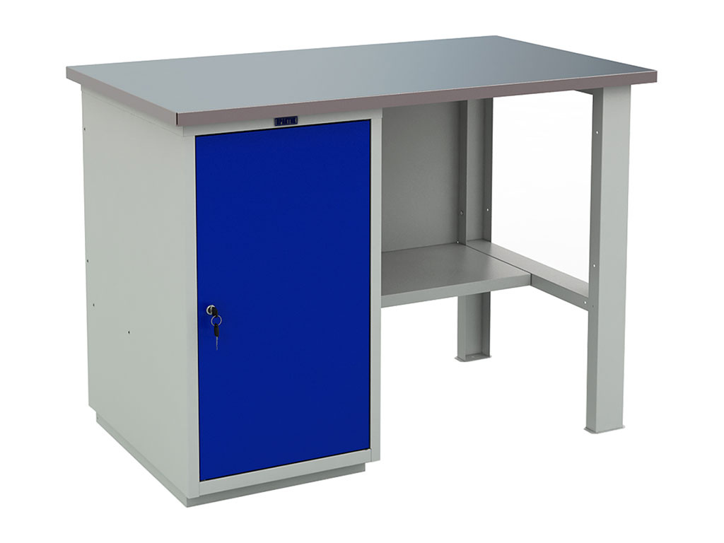 - Верстак окрашен порошковой краской, цвет покрытия корпуса серый шагрень (RAL 7038), лицевая панель дверцы тумбы – синий шагрень (RAL 5002)