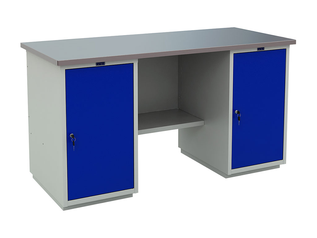 - Верстак окрашен порошковой краской, цвет покрытия корпуса серый шагрень (RAL 7038), лицевая панель дверцы тумбы – синий шагрень (RAL 5002)