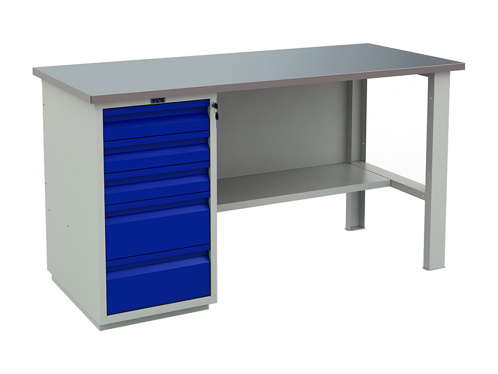 - Верстак окрашен порошковой краской, цвет покрытия корпуса серый шагрень (RAL 7038), лицевая панель дверцы тумбы – синий шагрень (RAL 5002)