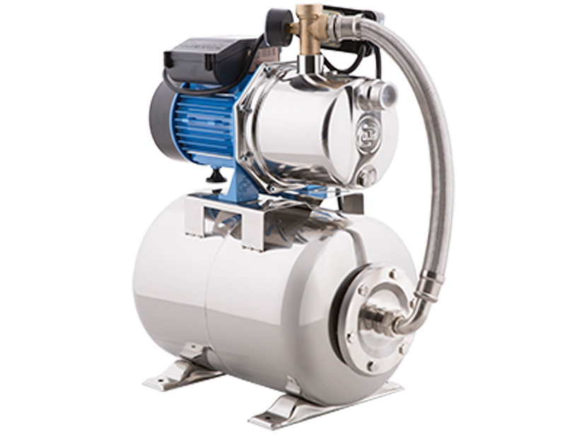 Насосная станция укомплектована поверхностным самовсасывающим электронасосом, гидроаккумулятором из нержавеющей стали емкостью 24 литра, реле давления, манометром, соединительной арматурой и электрошнуром с вилкой. Насос состоит из двух основных частей — насосной части и электродвигателя, которые крепятся на переходном фланце. Корпус насоса выполнен из нержавеющей стали, а рабочее колесо и проточный блок «направляющий аппарат — трубка Вентури — сопло» — из износостойких пластических материалов. Алюминиевый переходной фланец со стороны насосной части отделен от контакта с водой пластмассовой крышкой. Графито-керамические торцевые самовсасывающиеся уплотнения предотвращают возможность внешней утечки из насосной части. Асинхронный короткозамкнутый электродвигатель включает в себя статор, подшипниковые щиты, короткозамкнутый ротор и коробку выводов. Статор электродвигателя защищен термопротектором и охлаждается вентилятором.