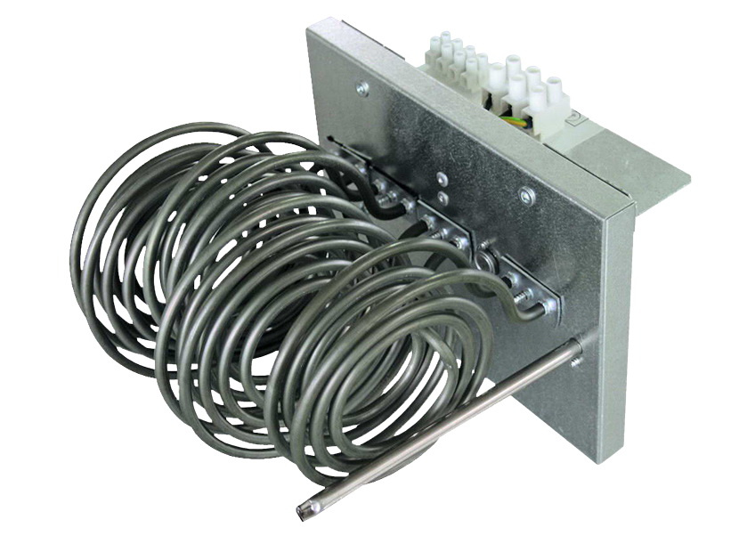 Электронагреватель EH/CAUF закрепляется при помощи специальной прижимной планки и 4 саморезов. Внутри вентиляторного блока предусмотрен разъем защищенный от ошибки при присоединении, в который подключается ответный штекер электронагревателя. Подключение питания электронагревателя осуществляется через клеммную коробку, расположенную на корпусе блока.