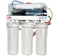 Система обратного осмоса серии Atoll включает в себя постфильтр, префильтры, накопительную емкость, мембрану и питьевой кран.
