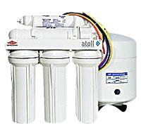 Система обратного осмоса серии Atoll включает в себя постфильтр, префильтры, накопительную емкость, мембрану и питьевой кран.